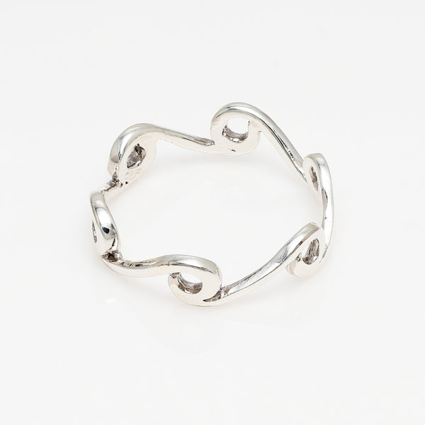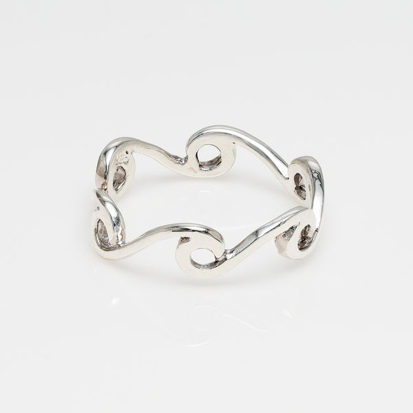 Inspired by the fluid motion of ocean swells, the AquaGeo Open Curls Wave Ring features a continuous band of sculpted curves that flow gracefully around the finger. Crafted in high-polish sterling silver, each open loop creates airy elegance while maintaining a bold, modern silhouette.